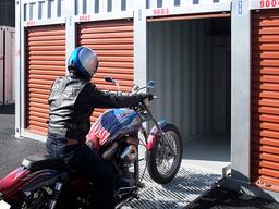 スロープ付きのバイクボックスをご用意しました。 棚もあるので、ヘルメットなどの荷物を整理して収納することが出来ます。