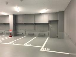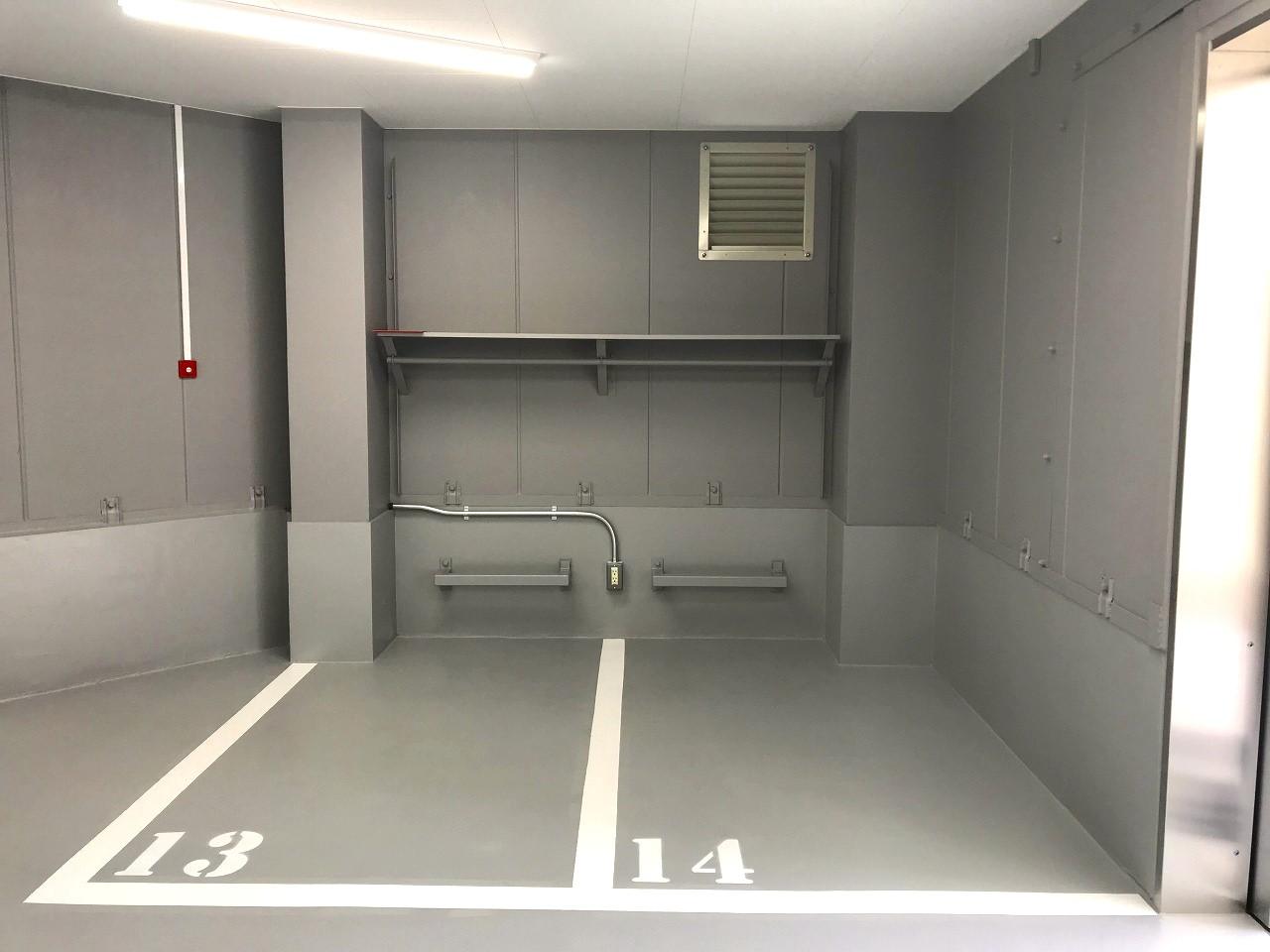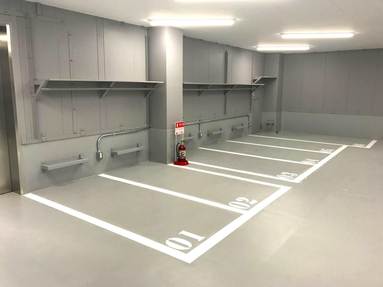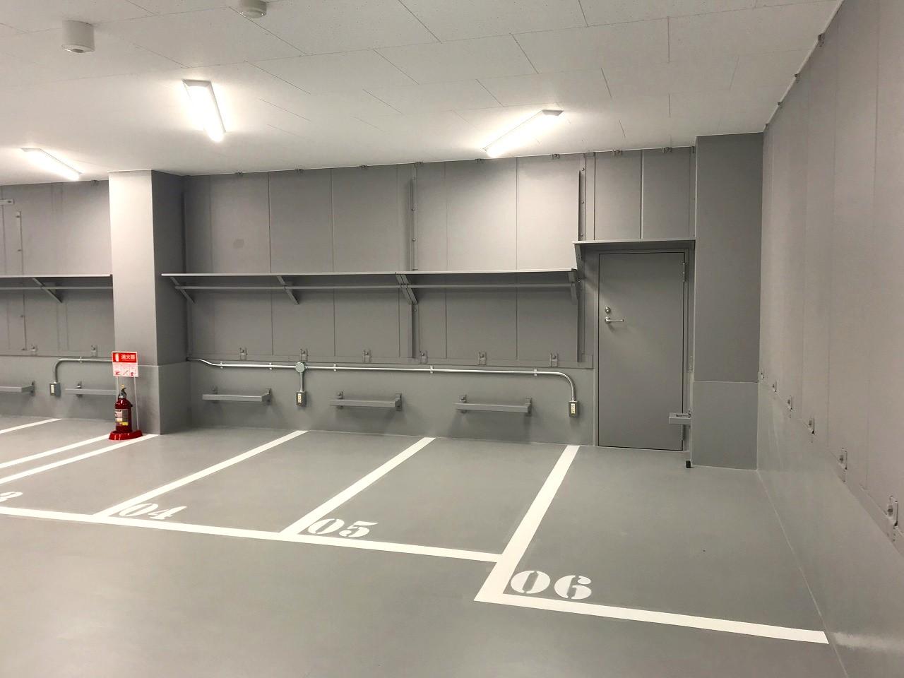 24時間出し入れ可能な屋内型バイク駐車場。入口にセキュリティを設けており関係者しか入ることが出来ず、荷物が置ける棚と建物内には地球ロック用のバリカーもある為、安心してバイクを保管いただけます。バッテリーチャージャーも設置出来るようコンセントを用意しております。