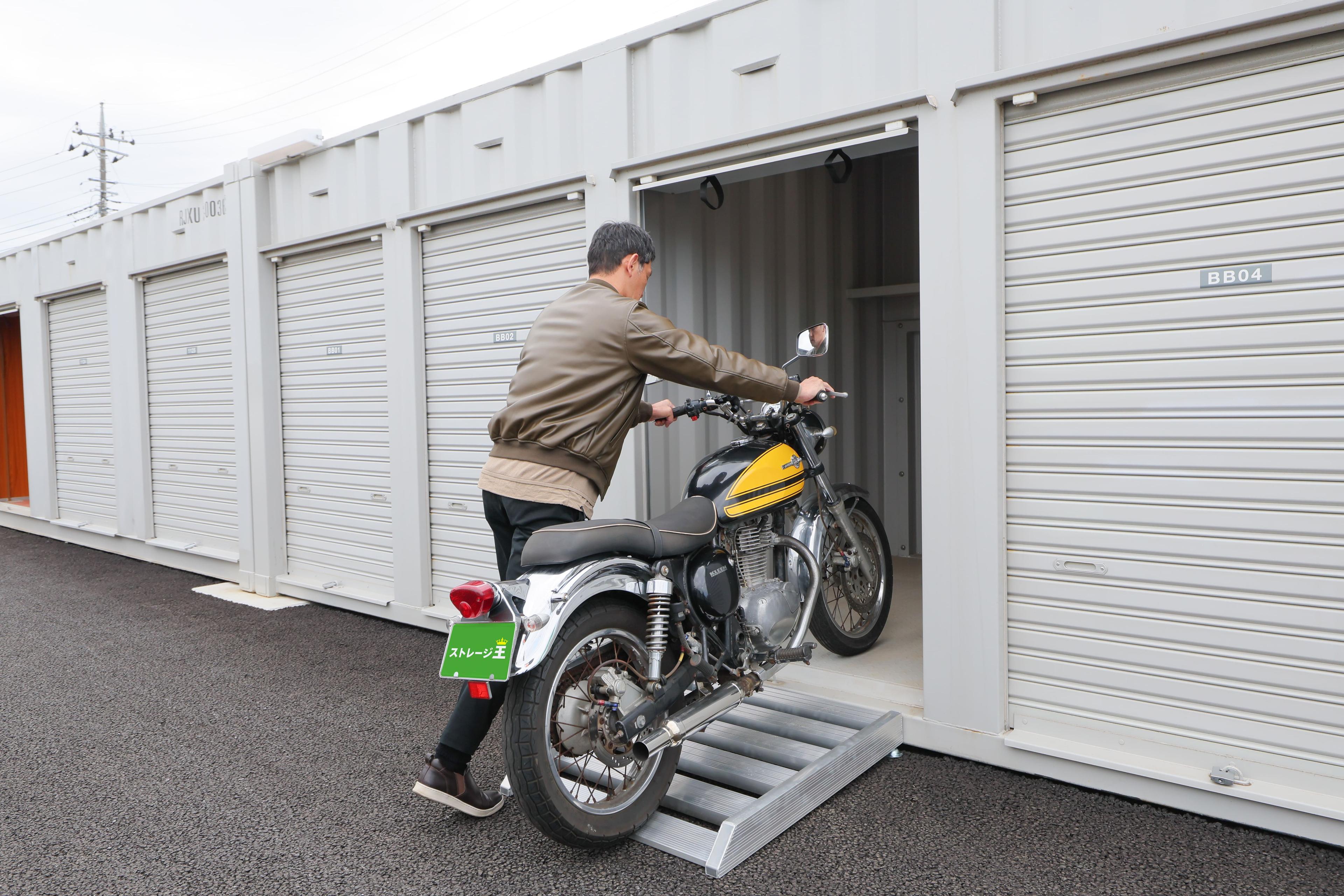 あなたの大切なバイクを風雨から守る待望のバイクボックスオープン。 スロープは軽く着脱式の為、かんたんにバイクを収納することが出来ます。