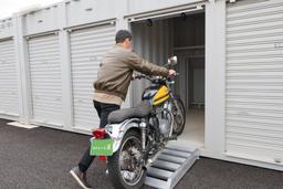 あなたの大切なバイクを風雨から守ります。 スロープは軽く脱着式のため、かんたんにバイクを収納することが出来ます。 店舗内照明や室内照明も設置されており夜間でも安全に明るくご利用いただけます。